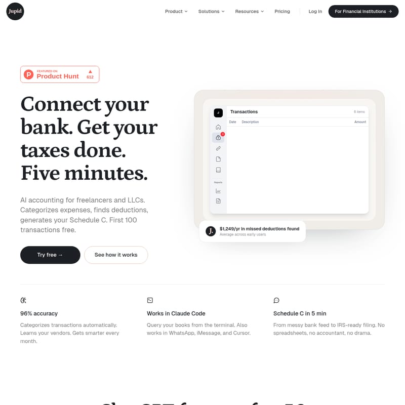 Jupid ist ein hochmodernes KI-Buchhaltungssystem, das speziell für moderne Unternehmer, Freelancer und LLCs entwickelt wurde. Es fungiert als Ihr digitaler Buchhalter, der direkt mit Ihren Finanzinstituten verbunden ist. Jupid kategorisiert Ausgaben automatisch, findet versteckte steuerliche Abzüge und bereitet Ihr Schedule C in weniger als fünf Minuten vor.