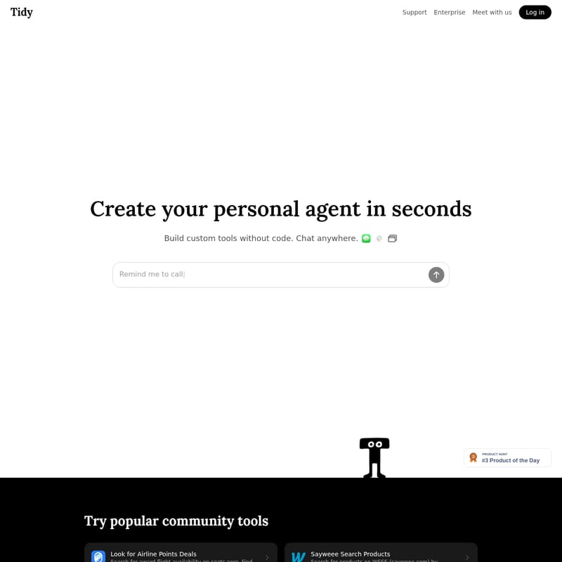 En la era digital actual, la eficiencia es la clave del éxito. Tidy surge como una solución integral para aquellos que buscan optimizar su tiempo y automatizar procesos sin la necesidad de saber programar. Desarrollado por Pond, Tidy permite a cualquier usuario crear su agente personal en segundos, transformando la manera en que interactuamos con la tecnología y gestionamos nuestras tareas cotidianas.
