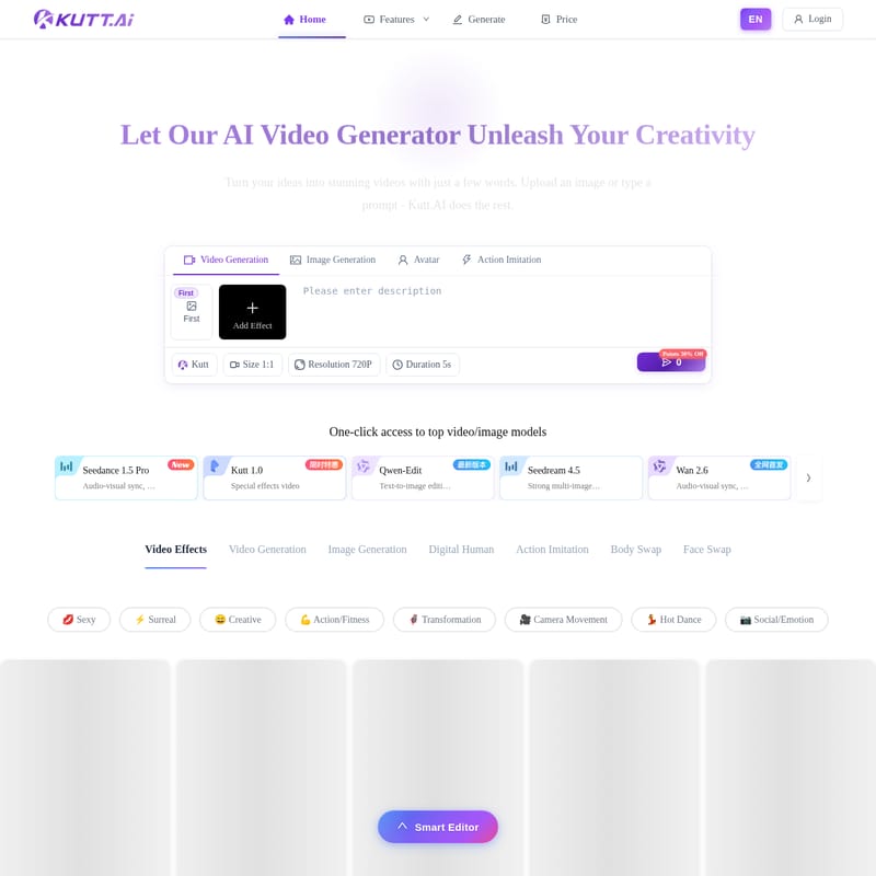 Kutt.AI est un générateur de vidéo AI révolutionnaire qui permet aux créateurs et aux entreprises de transformer des prompts textuels ou des images statiques en vidéos cinématographiques de haute qualité. Grâce à l'intégration des modèles les plus avancés comme Wan 2.6 et Seedance 1.5 Pro, cette plateforme offre une suite complète d'outils incluant le text-to-video, l'image-to-video, la création d'avatars numériques, le face swap et l'imitation d'actions. Avec plus de 100 effets spéciaux et une résolution 720P/4K, Kutt.AI simplifie la production vidéo professionnelle, permettant de générer du contenu viral en moins de 60 secondes sans aucune compétence en montage.
