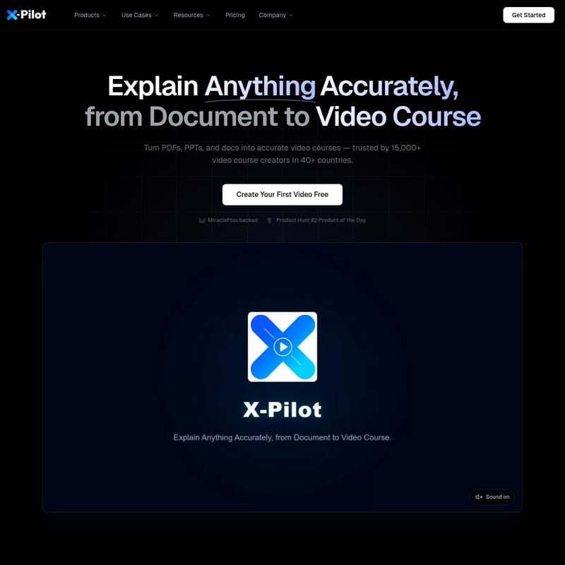 X-Pilot is een geavanceerd platform waarmee creators en bedrijven documenten zoals PDF's en PPT's direct omzetten in professionele videocursussen. Met AI-gestuurde kennisvisualisatie, natuurlijke taalbewerking en ondersteuning voor 160+ talen, biedt X-Pilot een efficiënte oplossing voor educatie en training zonder complexe videobewerking. Vertrouwd door meer dan 15.000 creators wereldwijd, garandeert het platform 100% nauwkeurigheid bij het renderen van formules en data.