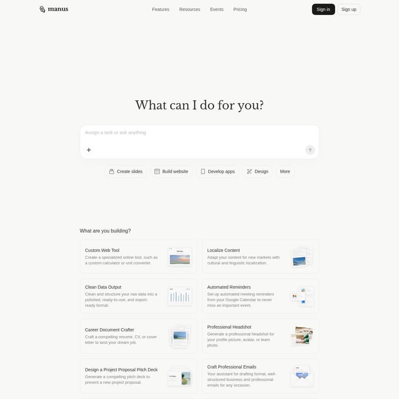 Manus AI to narzędzie umożliwiające tworzenie spersonalizowanych treści, projektowanie aplikacji, generowanie profesjonalnych dokumentów i automatyzację zadań. Dzięki szerokiej gamie funkcji, takich jak projektowanie stron internetowych, pisanie e-maili, tłumaczenia, oraz przetwarzanie danych, użytkownicy mogą efektywnie zarządzać swoimi projektami i zadaniami w różnych dziedzinach. Manus AI jest idealnym rozwiązaniem dla osób szukających narzędzi do poprawy produktywności i organizacji pracy.