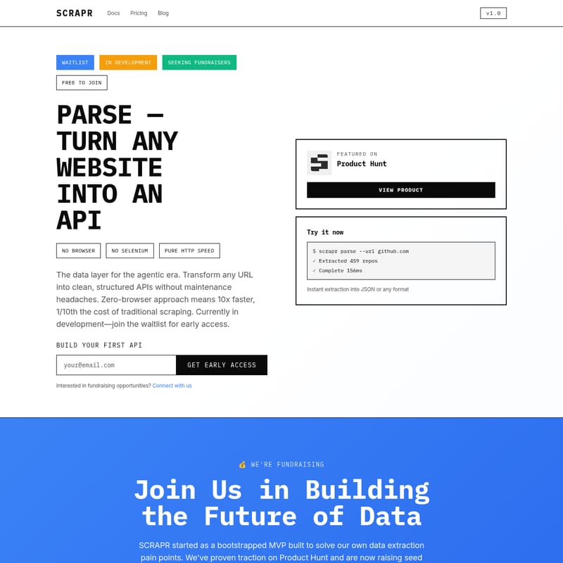 SCRAPR to nowoczesna warstwa danych dla ery agentów AI, która pozwala zamienić dowolny adres URL w czyste, ustrukturyzowane API. Dzięki podejściu „zero-browser” i natywnej intercepcji sieciowej, SCRAPR oferuje 10-krotnie większą prędkość oraz 10-krotnie niższe koszty w porównaniu do tradycyjnych rozwiązań takich jak Puppeteer czy Selenium. Narzędzie eliminuje problemy z utrzymaniem i łamliwymi selektorami, dostarczając dane w formacie JSON w czasie poniżej 200ms. SCRAPR wspiera zaawansowane akcje, takie jak wypełnianie formularzy i rezerwacje, oferując jednocześnie CLI, SDK oraz wsparcie dla webhooków. To idealne rozwiązanie dla programistów budujących infrastrukturę danych gotową na AI.