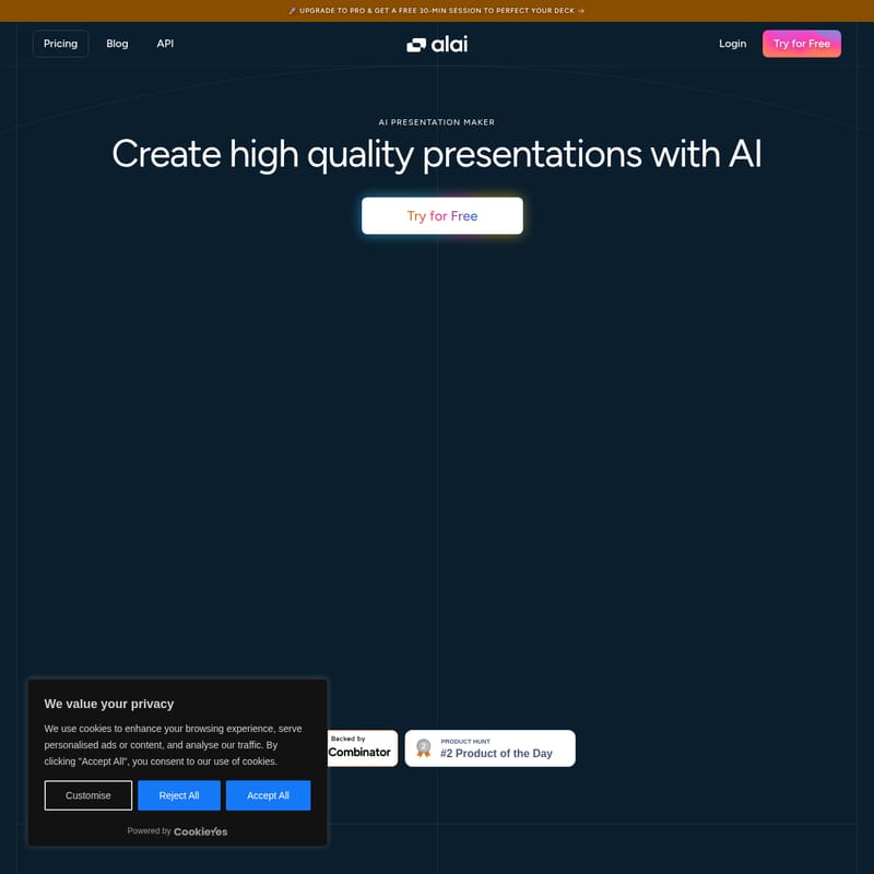 Start creating your presentations with Alai AI Presentation Maker today and upgrade to Pro for advanced features and a free 30-minute session to perfect your deck.