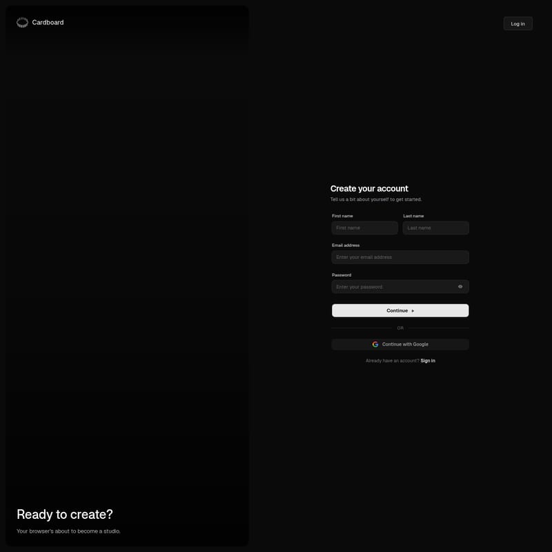 Cardboard is an innovative digital studio accessible directly through your web browser, designed to streamline the creative process. By providing a user-friendly interface for both individuals and teams, Cardboard allows users to transform their digital workspace into a professional creative environment. With seamless integration options like Google login and a simple account setup process, it serves as a central hub for builders, designers, and creators to bring their ideas to life. Whether you are working on personal projects or professional collaborations, Cardboard provides the foundational tools needed to start creating immediately without the need for complex software installations.