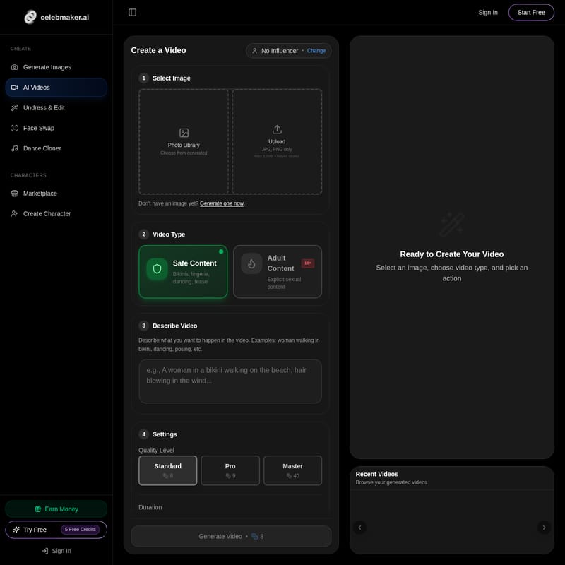 - Choose Video Type: Select whether your project falls under Safe Content (Bikinis, lingerie, dancing) or Adult Content (18+ Explicit sexual content).