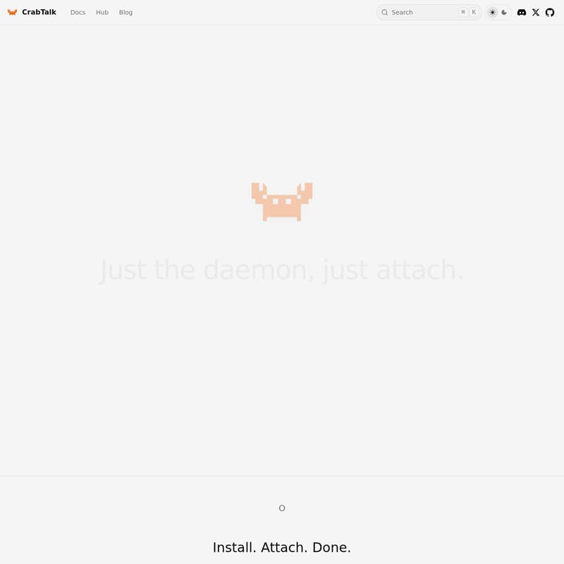 Getting started with CrabTalk is designed to be as fast as the daemon itself. The philosophy is simple: Install. Attach. Done.