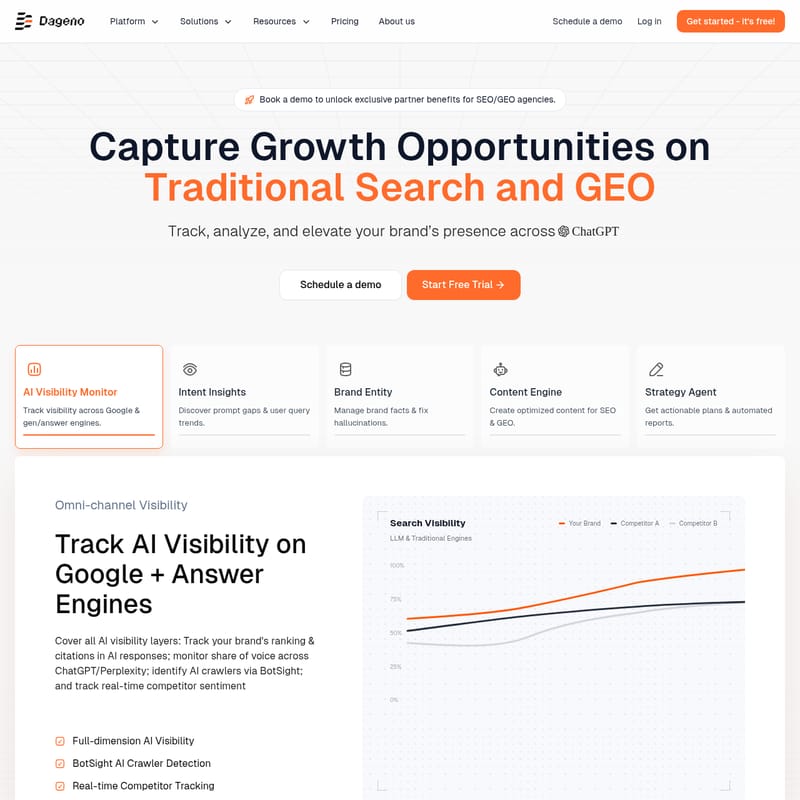 Dageno is a comprehensive AI SEO and Generative Engine Optimization (GEO) platform designed to track, analyze, and elevate brand presence across traditional search engines and AI-driven answer engines like ChatGPT, Perplexity, and Gemini. By fusing traditional SEO data with advanced GEO logic, Dageno helps marketing teams identify 'Prompt Gaps,' manage brand entities to eliminate hallucinations, and scale programmatic content. The platform features an AI Visibility Monitor for real-time tracking, a Strategy Agent for automated growth roadmaps, and a Content Engine for high-volume prompt interception. Whether you are an enterprise managing global brand perception or an agency scaling client ROI, Dageno provides the tools to secure citations and authoritative mentions in the generative web. With features like BotSight crawler detection and Schema Injection, Dageno moves beyond simple keyword tracking into the era of conversational intent and AI-driven referral traffic.