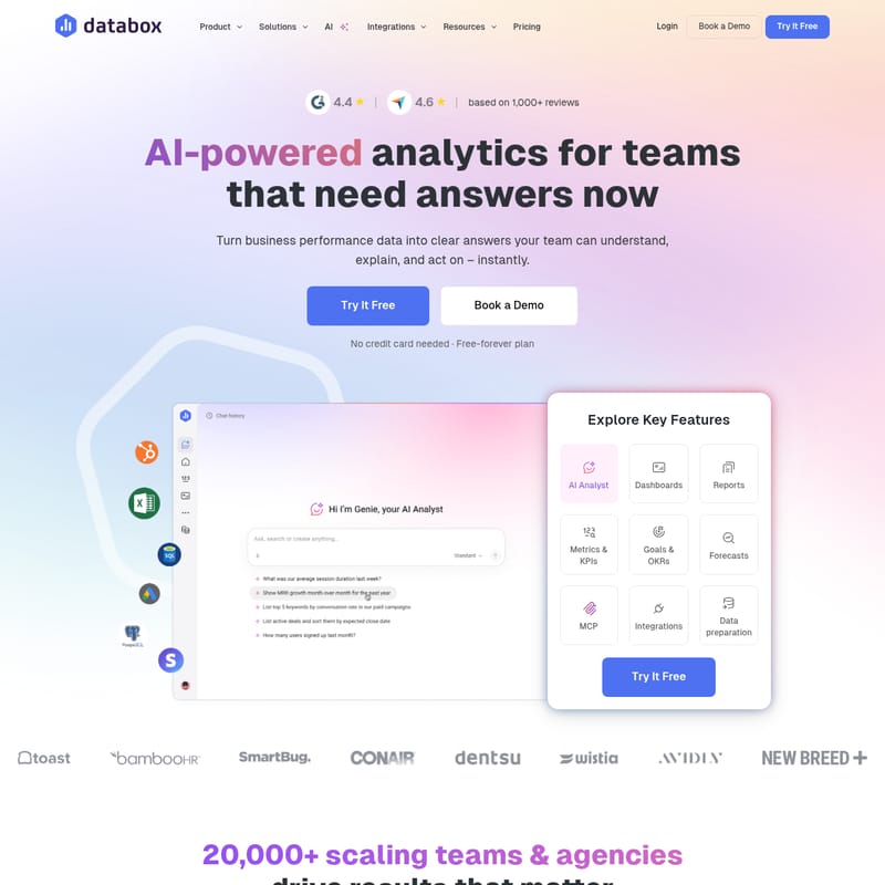 Databox is a comprehensive business intelligence platform designed to centralize, visualize, and analyze data from over 130 integrations. It empowers teams to move from fragmented data silos to actionable insights using AI-powered analysis, automated reporting, and real-time performance tracking. With features like Genie AI Analyst, no-code data preparation, and goal tracking, Databox eliminates the complexity of traditional BI, offering a self-service solution for SaaS companies, agencies, and executives to make faster, data-driven decisions.