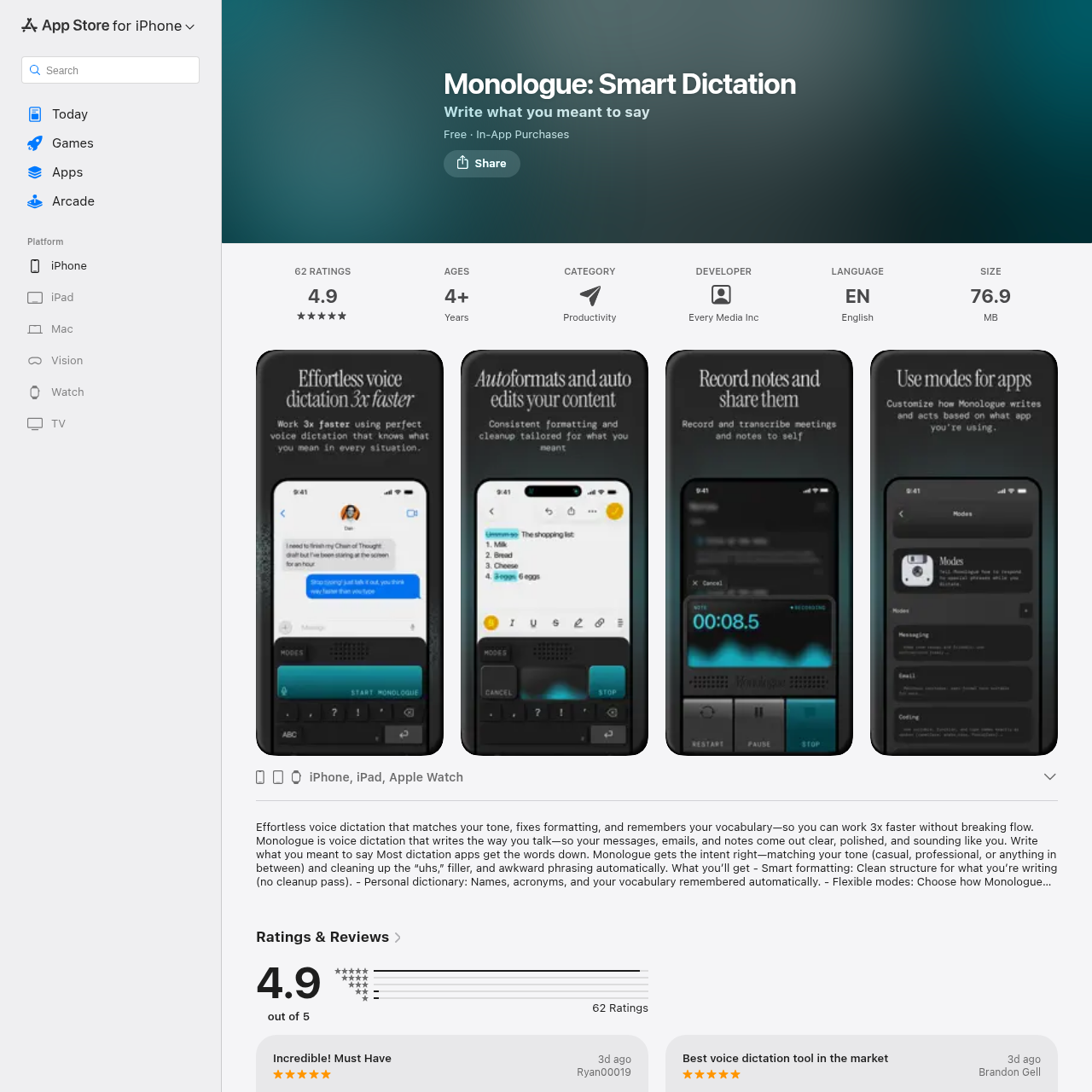 With a 4.9-star rating and glowing reviews highlighting its speed and innovative design, Monologue: Smart Dictation is a must-have tool for anyone looking to boost their productivity through the power of voice.