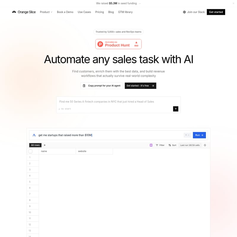 In the modern sales landscape, efficiency and data accuracy are the cornerstones of success. Orange Slice emerges as a premier solution designed to help sales and RevOps teams automate any sales task with the power of artificial intelligence. By leveraging Orange Slice, teams can find potential customers, enrich them with the best available data, and build revenue workflows that are robust enough to survive real-world complexity. Currently trusted by over 5,000 sales and RevOps teams, Orange Slice recently announced a significant milestone, having raised $5.3M in seed funding to further its mission of AI-driven sales automation.