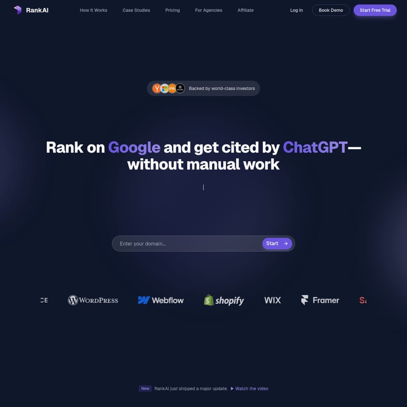 RankAI is a world-first autonomous AI SEO and GEO agency designed to drive high-intent organic traffic at a fraction of the cost of traditional agencies. The platform automates the entire search growth process, including deep business research, keyword strategy, high-quality content creation, and technical optimization. Unlike standard tools that only provide data, RankAI executes actions autonomously to help businesses rank on Google and get cited by AI engines like ChatGPT, Gemini, and Perplexity. With features like 'Rewrite Until It Works,' RankAI monitors performance and rebuilds non-performing pages to ensure results. Trusted by over 100 ambitious ecommerce and B2B businesses, RankAI provides measurable impact through no-fluff reporting based on Google Search Console data. It integrates seamlessly with major platforms like Shopify, WordPress, and Webflow, offering a scalable growth engine that delivers early results in under 30 days.
