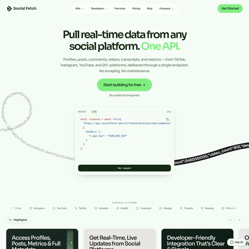 By eliminating the need for scraping and constant maintenance, Social Fetch allows engineering teams to focus on building features rather than babysitting infrastructure. Whether you are integrating data from TikTok, Instagram, YouTube, or LinkedIn, Social Fetch delivers a consistent, predictable JSON response every time.