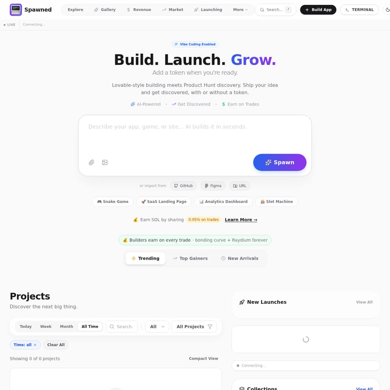 Spawned is a revolutionary platform combining Lovable-style AI building with Product Hunt discovery. It enables users to build, launch, and grow projects using AI agents, GitHub, or Figma. With features like Vibe Coding, revenue sharing on trades, and SocialFi integration, Spawned helps creators monetize their work through bonding curves and Raydium migration. Whether you are building SaaS landing pages, AI agents, or SocialFi apps, Spawned provides the infrastructure to ship ideas and earn SOL rewards.