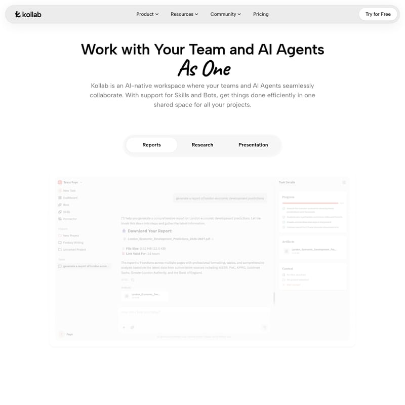 В отличие от типичных чат-инструментов на базе ИИ, Kollab превращает искусственный интеллект в полноценного члена команды. В этом рабочем пространстве вы можете создавать отчеты, проводить исследования и готовить презентации, работая бок о бок с ИИ. Главная цель Kollab — обеспечить видимость, связность и исполнимость всех рабочих процессов, минимизируя время на отслеживание задач и максимизируя продуктивность.
