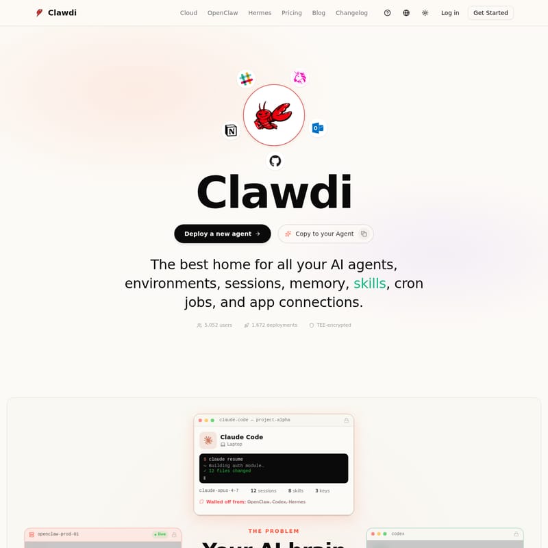 Clawdi 是为所有 AI 智能体、环境、会话、记忆及技能打造的最佳归宿。它打破了不同 AI 框架间的孤岛,支持 OpenClaw、Hermes、Claude Code 等多种智能体,提供 TEE 加密保护及 500+ 应用集成。通过 Clawdi,用户可以在笔记本电脑上构建技能,并无缝同步至手机端继续操作,实现记忆与能力的全局共享,是开发者和 AI 爱好者的核心 AI 控制中心。