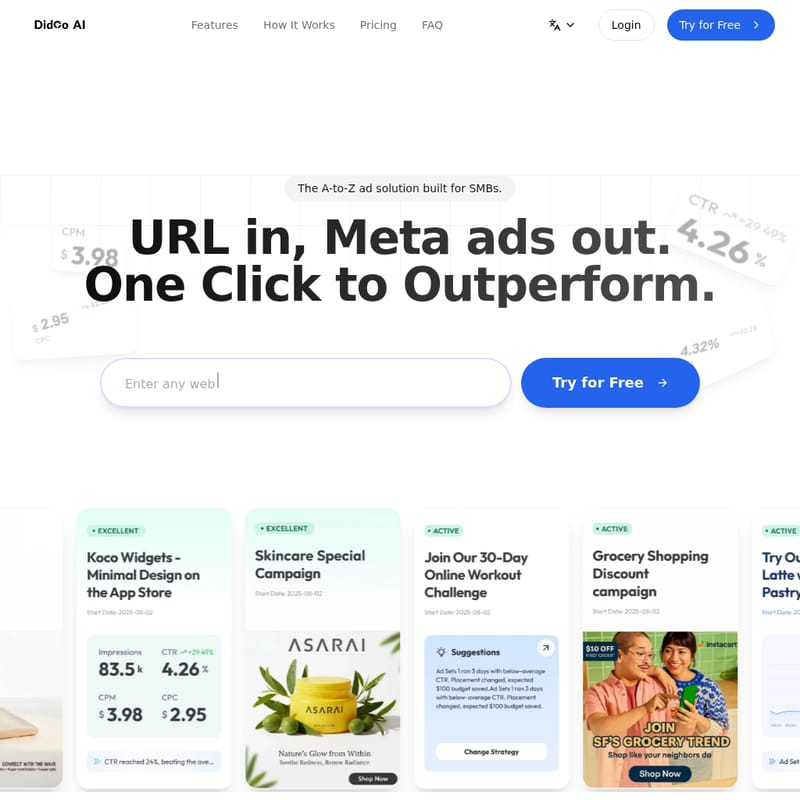 Didoo通过自动构建、运行并优化Meta广告,使广告主不再需要繁琐的设计和管理过程。用户只需粘贴网址,Didoo就会自动为其生成广告并启动。