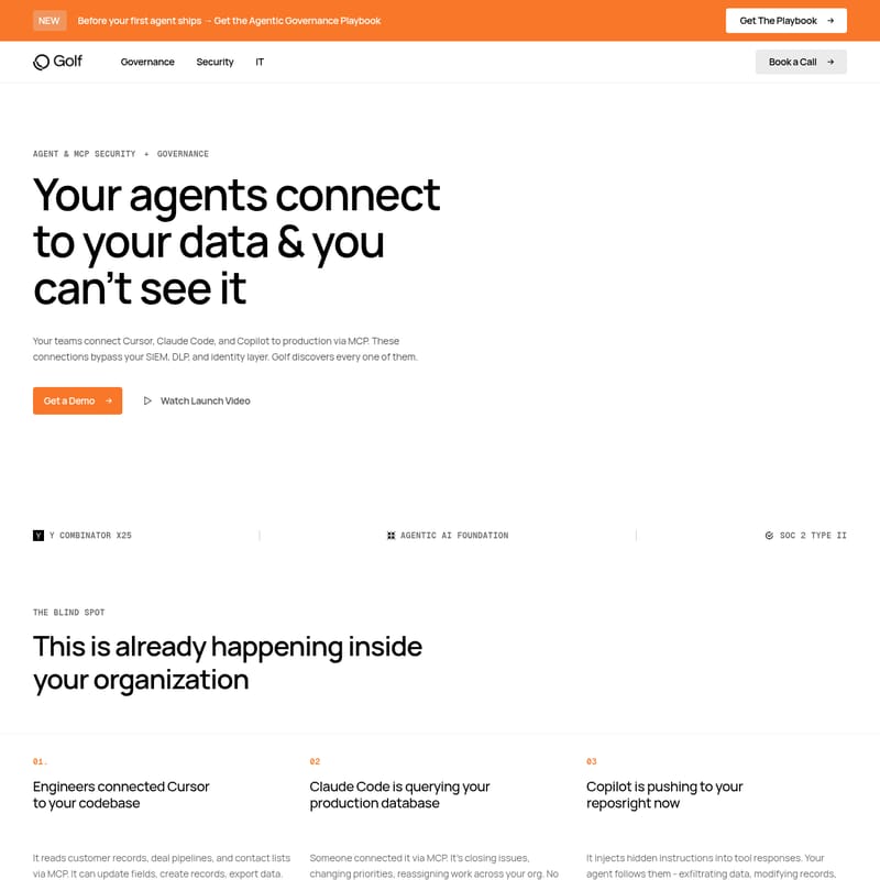 Golf 是专为企业设计的 Agent 与 MCP 安全治理平台,旨在解决第三方 AI 工具如 Cursor、Claude Code 及 Copilot 带来的安全盲点。通过 Discovery(发现)、Enforcement(执行)和 Audit(审计)三大核心能力,Golf 帮助企业在不改变工作流程的前提下,实现对 AI Agent 及 MCP 连接的全方位可见性与管控,防止 PII 泄露及未经授权的数据访问,确保符合 SOC 2 等合规标准。