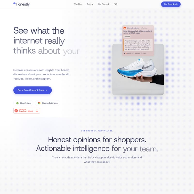 在当今的电商环境中,消费者在下单前往往会打开多个标签页进行“背景调查”。他们不再仅仅满足于品牌方的宣传,而是更倾向于在Reddit、TikTok、YouTube和Instagram等平台上寻找真实的反馈。Honestly 正是为此而生,它通过聚合互联网上关于您品牌的真实讨论,将其转化为强大的社交证明和可操作的产品智能。