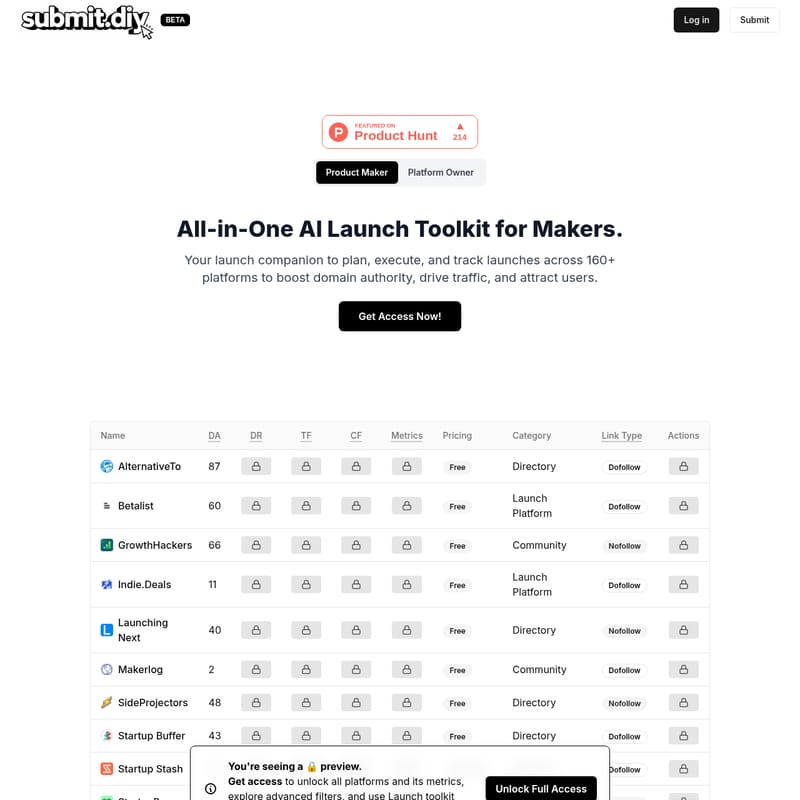 Submit.DIY 的前身是 2.5 年前在 Product Hunt 获得前 10 名的 “Product Launch AI”。如今,它进化为一个结合了精选分发渠道与 AI 营销能力的完整生态系统。